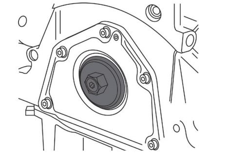 Important: Adaptorul poate fi montat doar într-o singură poziție pe arborele cotit. - Rotiți arborele cotit în sensul normal de rotație al motorului până când marcajul de pe adaptor se aliniază cu marcajul de pe flanșa de etanșare.