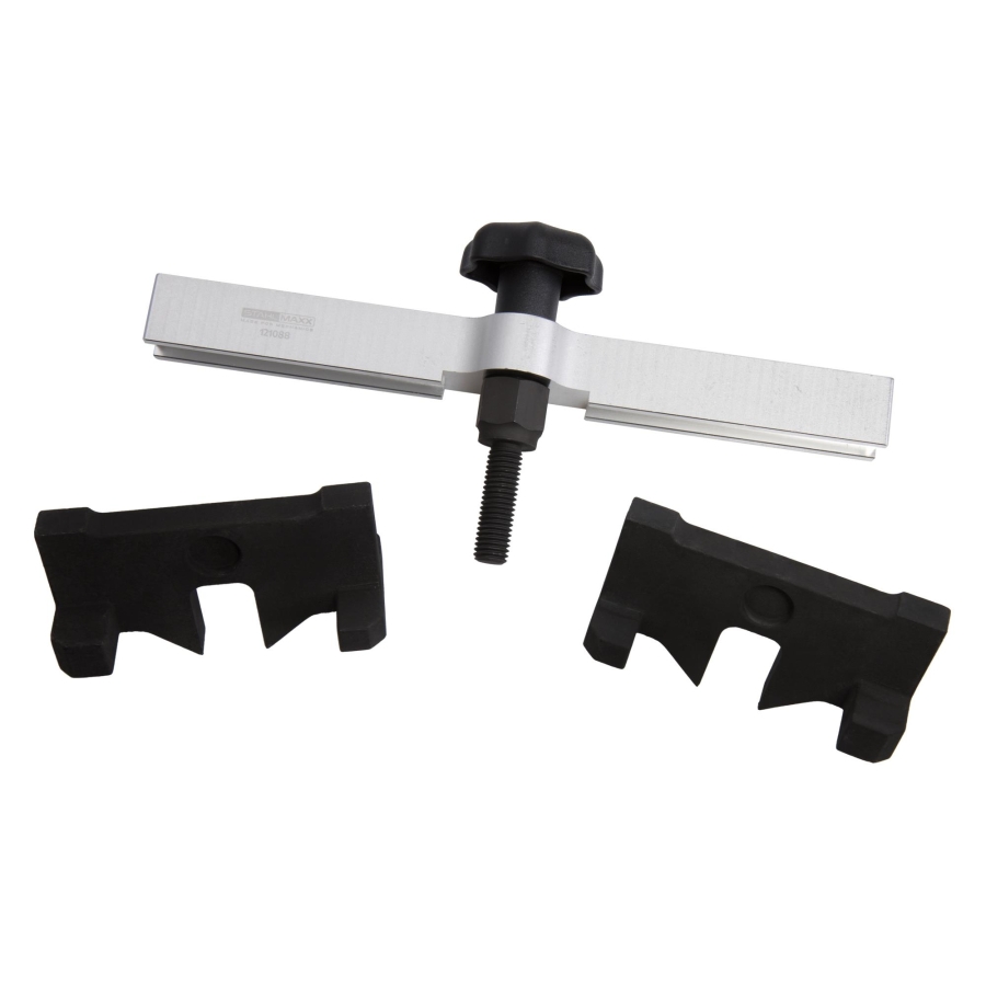 The tool consists of several components designed to work together for accurate camshaft alignment. The fixing plates (gauges) are mounted individually onto each camshaft and secured using a central holding bridge, which is bolted to the cylinder head.