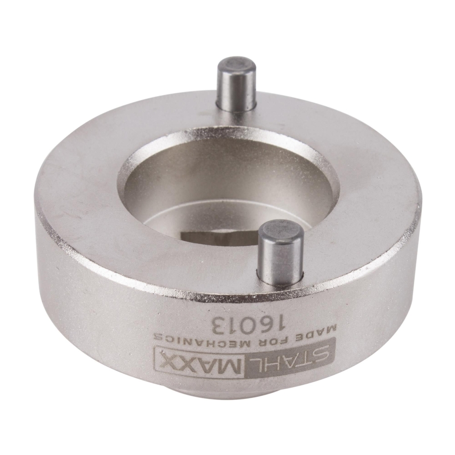 This specialized tool is designed for the safe and efficient removal and installation of the camshaft adjuster hub, also known as the variator base. It ensures proper handling of sensitive timing components and prevents damage during service operations.