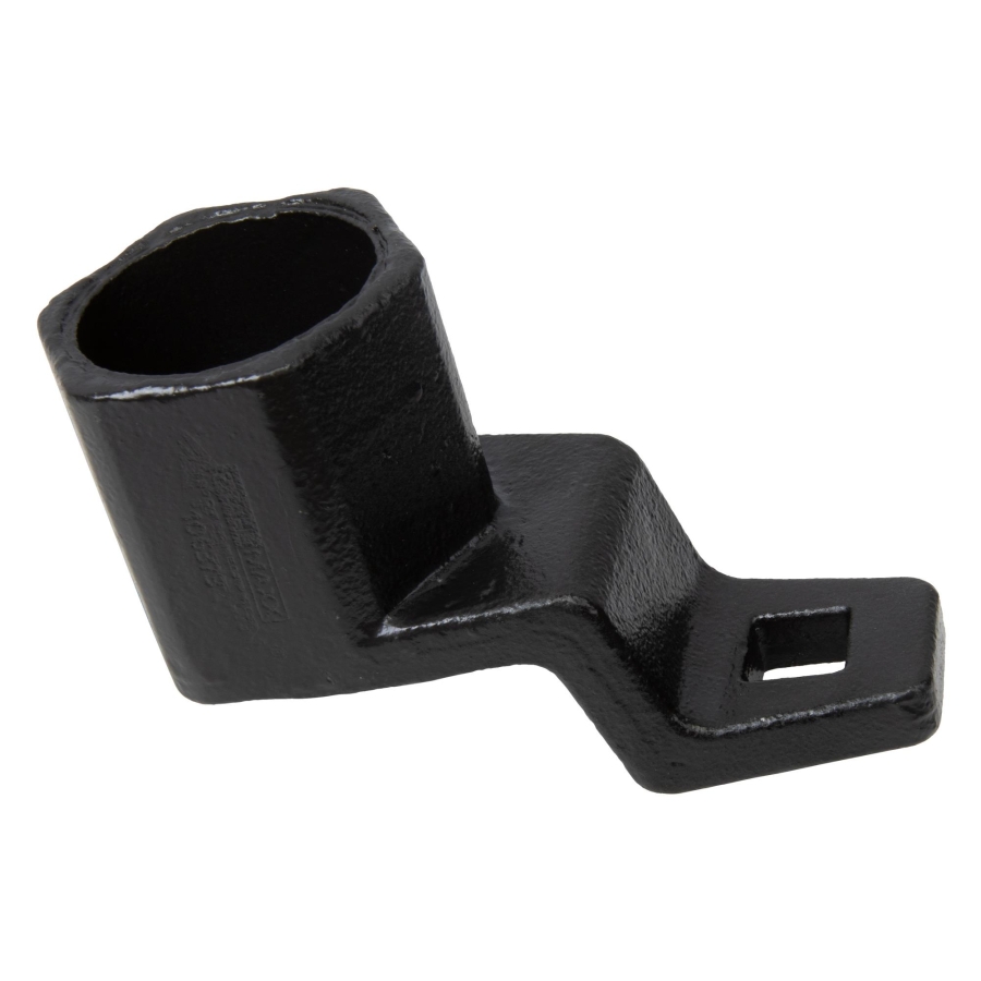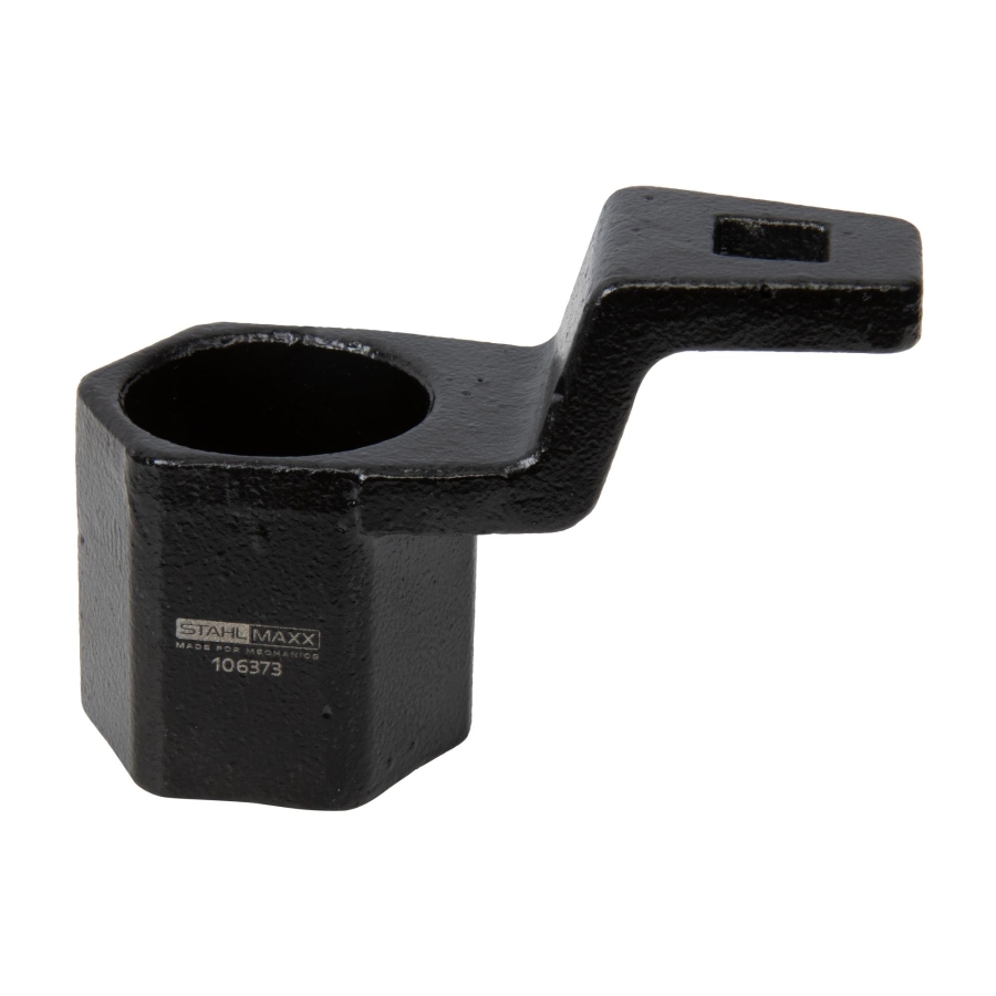The tool features a 50 mm opening and an angled design, allowing improved access in tight engine bays. It provides effective leverage and secure engagement with the crankshaft pulley.
