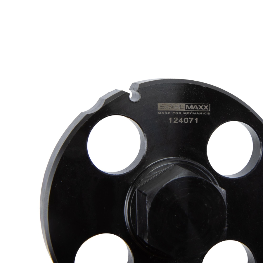 This special tool is designed for safely turning and holding the crankshaft via the four mounting bolts of the crankshaft pulley. It significantly simplifies the removal and installation of the crankshaft pulley and vibration damper on VAG diesel engines.