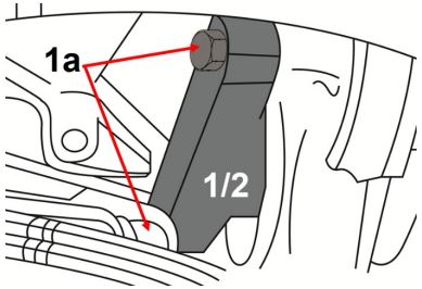 The flywheel locking tools (1 or 2) are mounted at the starter mounting points on the bell housing and prevent the flywheel from rotating when loosening or tightening the crankshaft pulley.
