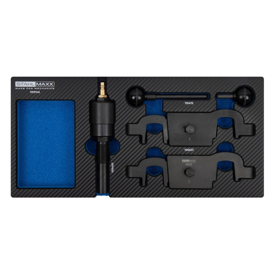 This high-quality engine timing tool set is designed for accurate adjustment of camshaft timing on Porsche engines with timing chains. It is essential for engine repair operations such as camshaft replacement, cylinder head service, and timing chain maintenance.