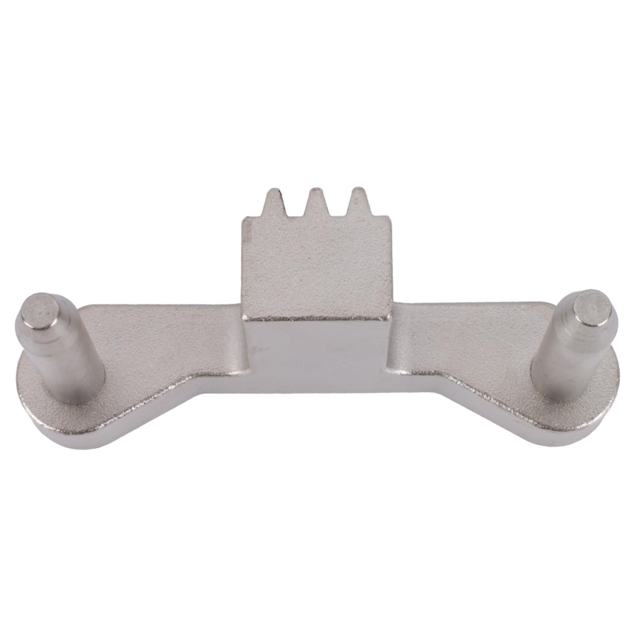 Specialized tool for locking the flywheel during engine service operations, ensuring correct crankshaft positioning when performing repair procedures.