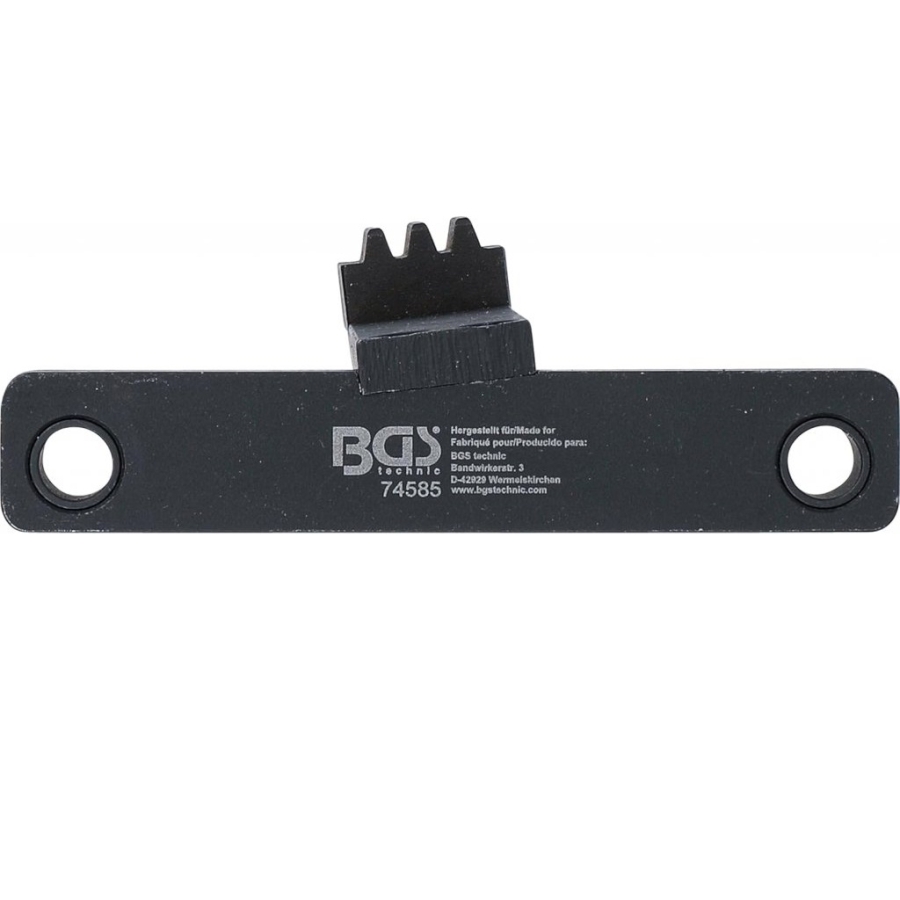 Flywheel locking tool used as a holding device for the crankshaft and starter ring gear. Installed in place of the starter motor to secure the flywheel when loosening or tightening the crankshaft pulley central bolt.