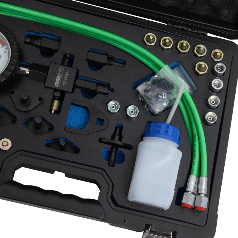 Unlike diagnostic methods relying solely on the vehicle’s pressure sensors, this kit performs direct physical measurements up to 2000 bar, providing reliable and accurate results even under extreme system loads.