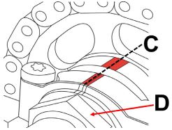 Marcajele (C) de pe capacul lagărului arborelui cu came și roata dințată trebuie să fie aliniate.