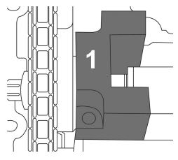 Rotiți arborele cu came cu cheia până când decupajele uneltei de reglaj (1) se pot așeza ușor peste profilul (D) al arborelui.
