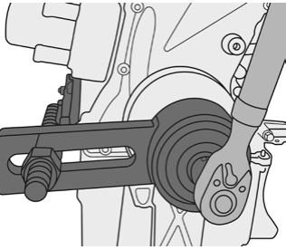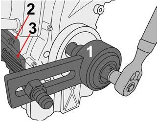 Montați cheia tubulară pe șurubul central al fuliei și fixați brațul multiplicatorului de cuplu (1) pe boltul filetat al adaptorului special (3).