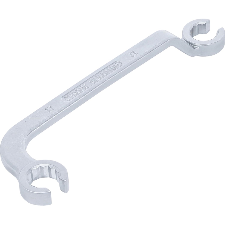 High-quality 17 mm double box wrench designed for diesel injection lines. Bent and angled for easy access in tight engine spaces. Made from durable chrome-vanadium steel with a matte chrome finish for long life and corrosion protection. Ideal for professional workshops and car enthusiasts.