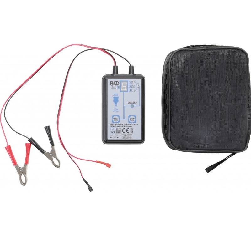 12V gasoline injector tester designed for quick and accurate diagnostics of individual fuel injectors. Features four pulse modes to detect clogged, leaking, or faulty injectors without removing them from the engine.