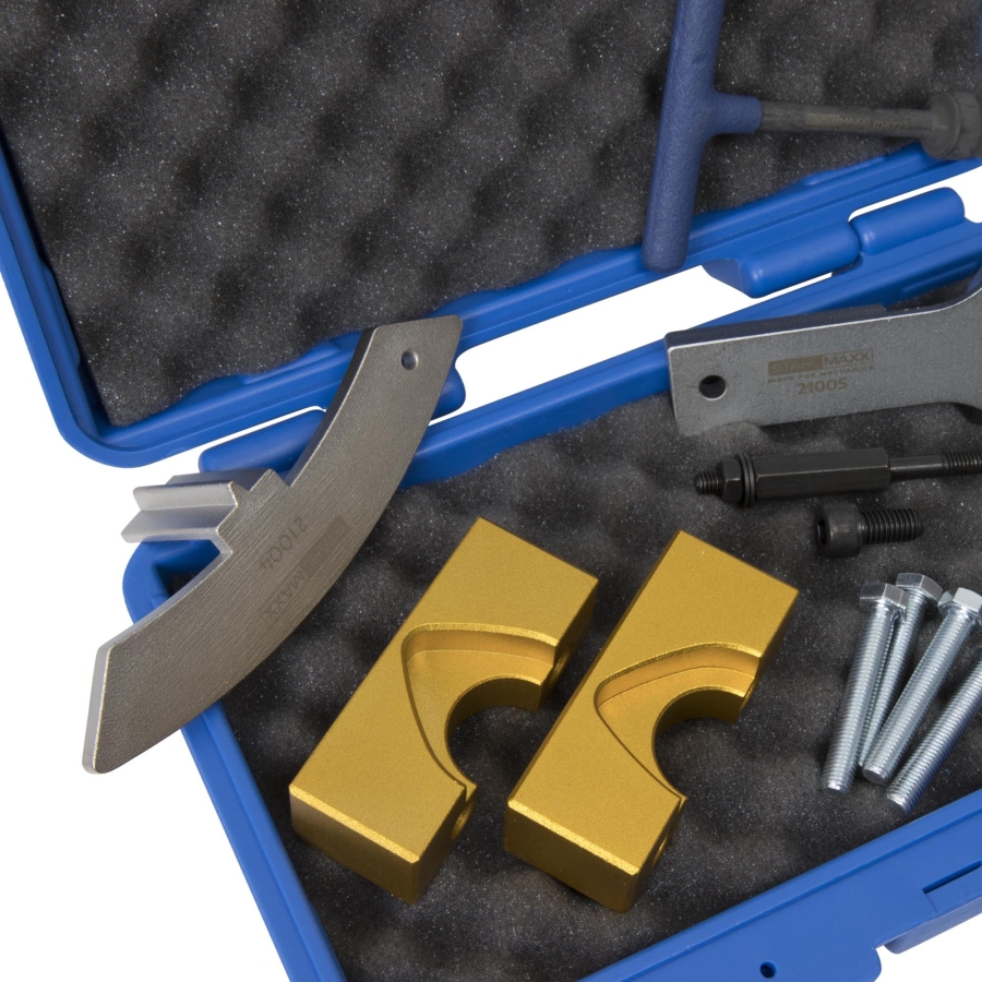 This specialized engine timing tool set is designed for precise locking and alignment of the crankshaft, camshafts, and flywheel during timing belt replacement or engine repair. The tools ensure correct engine timing positioning, preventing misalignment during maintenance procedures.