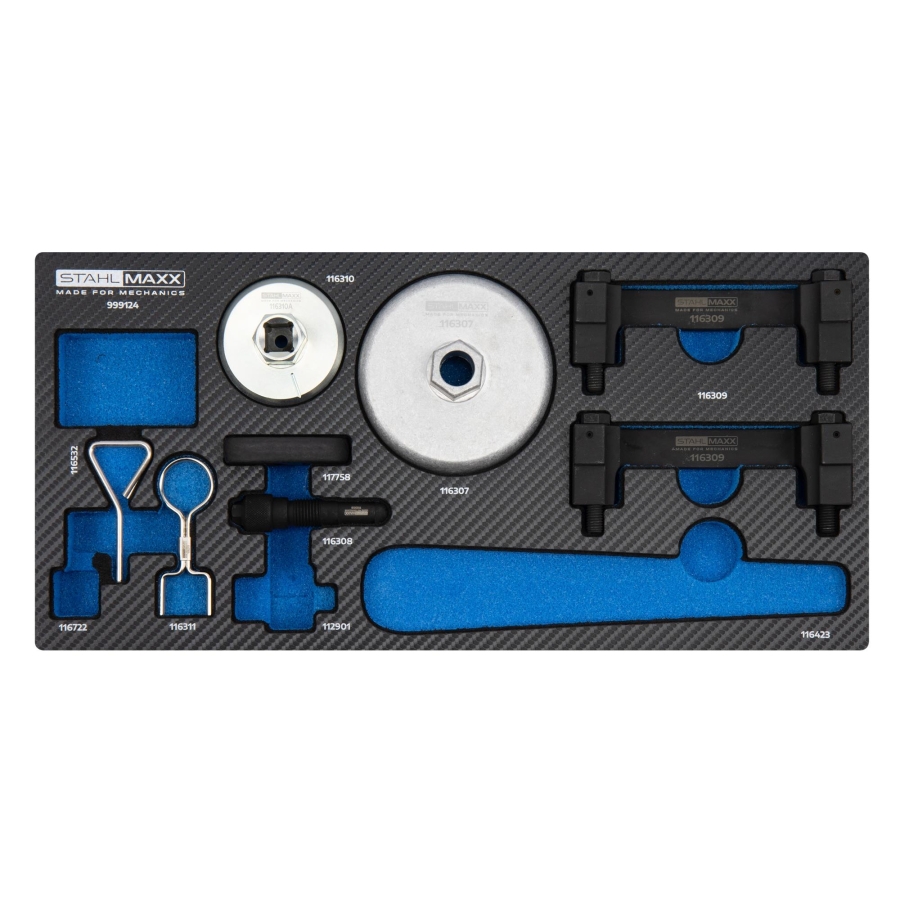 Delivered in a durable storage case with a carbon-look foam insert, the kit also fits standard workshop trolleys, providing efficient organization and accessibility.