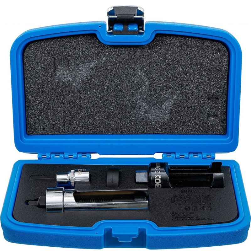 Set profesional pentru extragerea sigură și precisă a injectoarelor Bosch Common-Rail blocate la motoarele Mercedes CDI. Include arbore de tragere și cilindru de suport pentru extracție controlată.