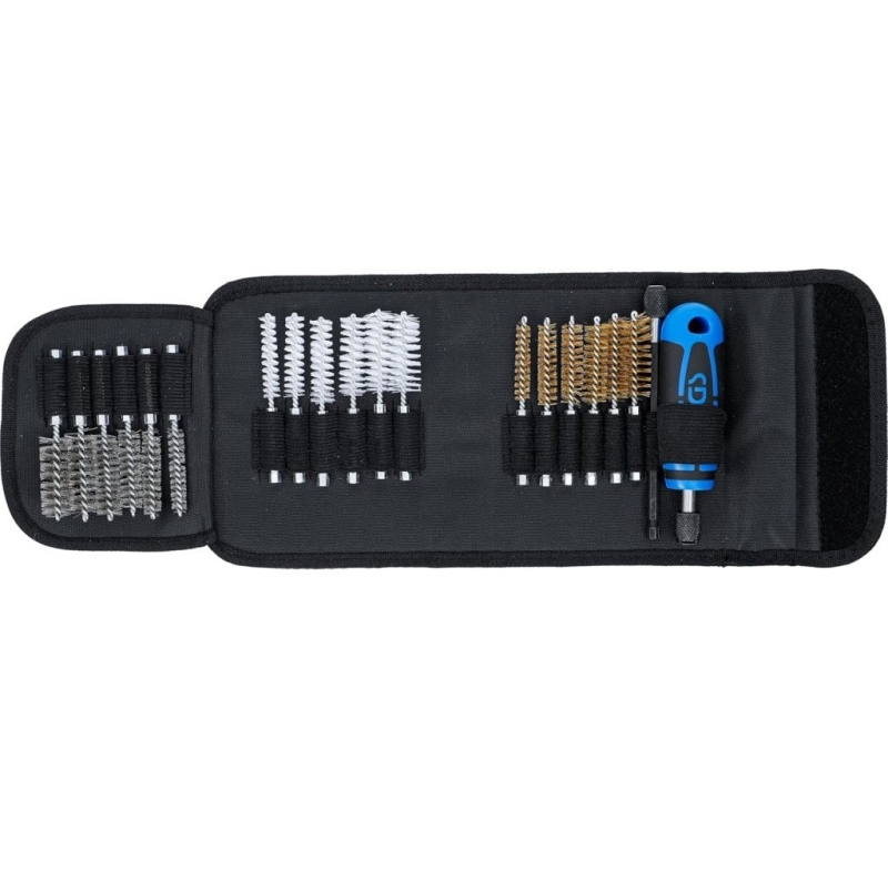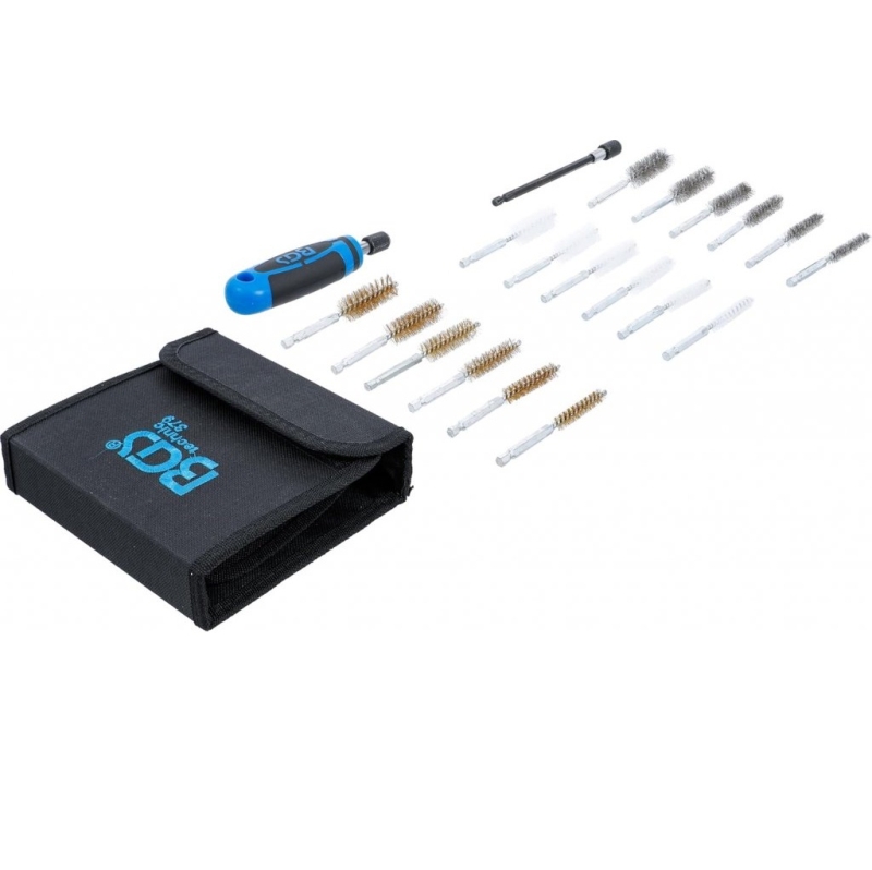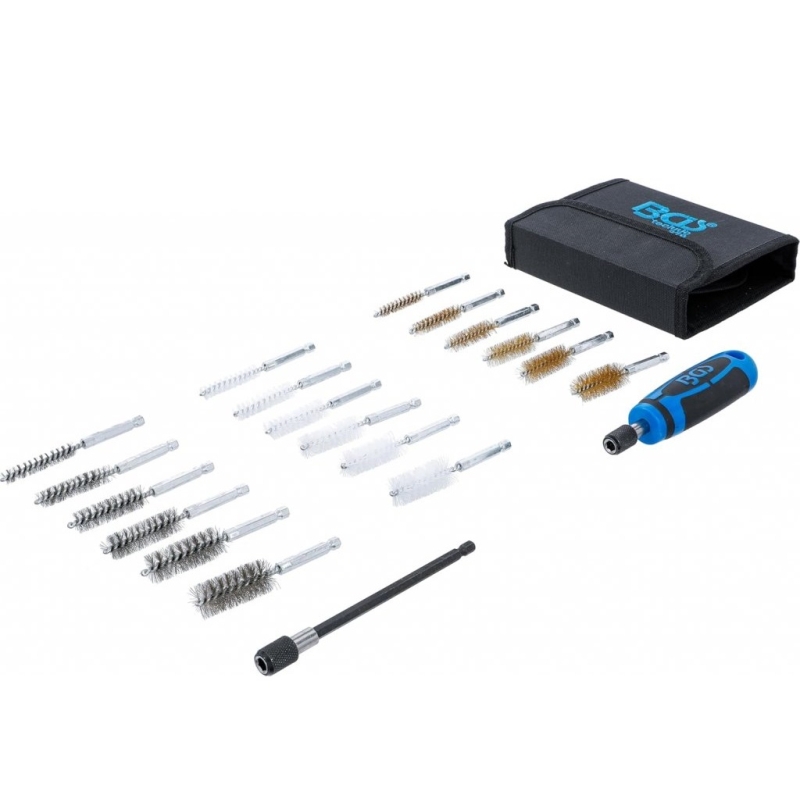 Set versatil de 20 de piese pentru curățare, lustruire și întreținere a diferitelor materiale. Include perii din alamă, nylon și oțel inoxidabil cu coadă hexagonală de 6,3 mm (¼"), compatibile cu majoritatea sculelor electrice și bormașinilor.