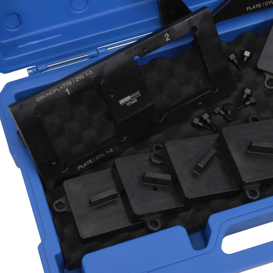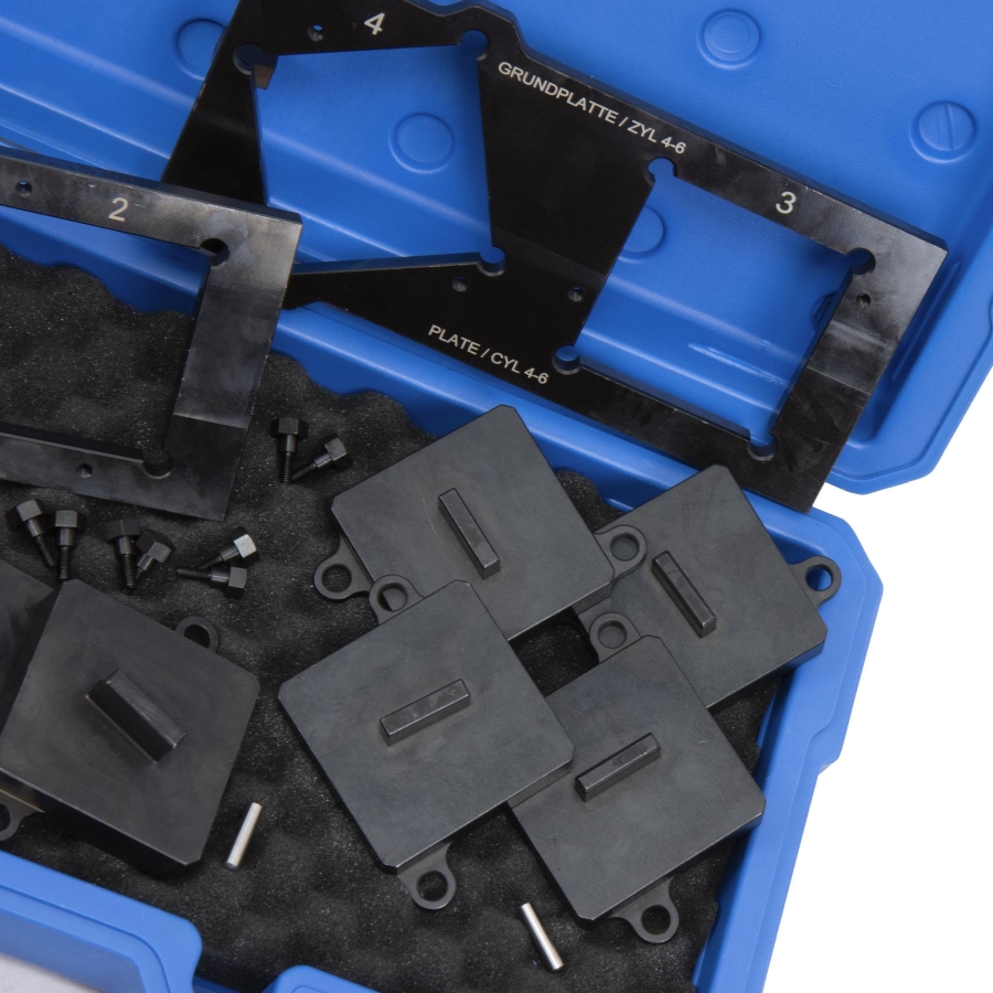 Setul conține toate componentele necesare pentru operațiuni profesionale de reglaj al distribuției.