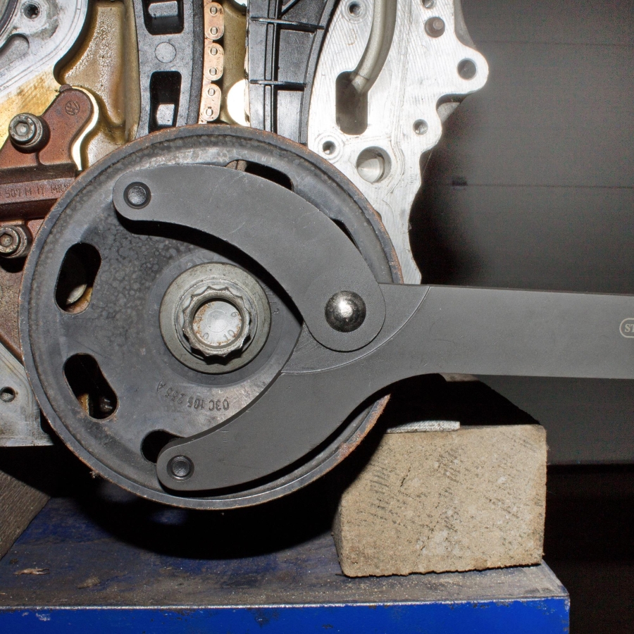 Designed for use on a wide range of vehicles and engines, this tool is compatible with most pulleys featuring holes, making it highly versatile for workshop applications.