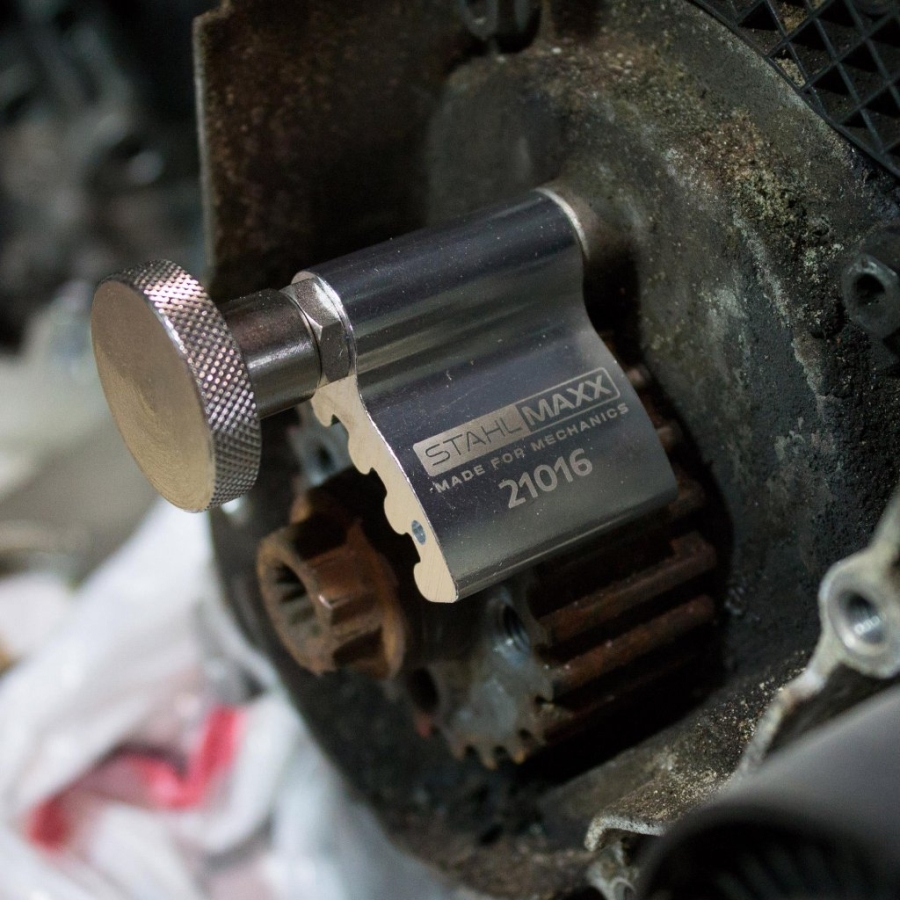 The crankshaft locking tool features an expansion function, allowing it to be securely clamped into the engine block: